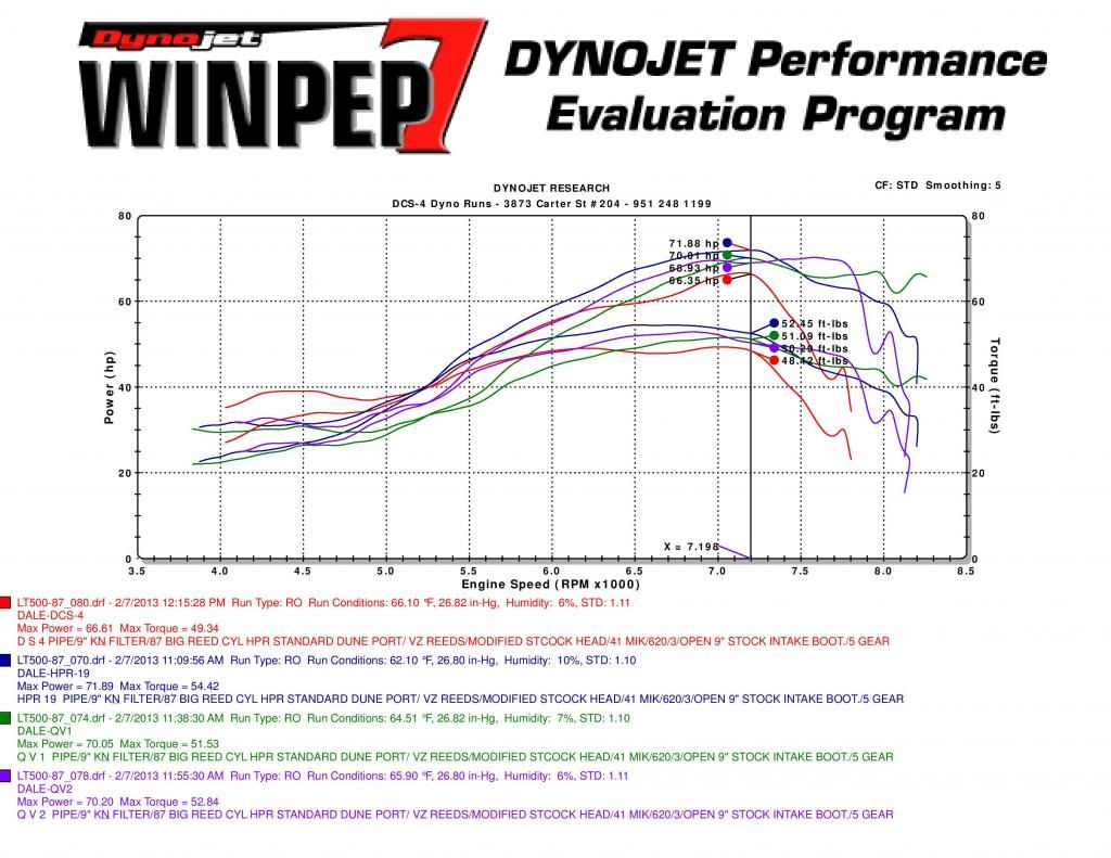 Dale,Point is, it's hard for me to believe that you and Mitch are unbiased in this instance (Mitch is selling pipes & you have spent and incredible amount of time, money, & effort with Jerry - that is not unbiased and transparent, great things have come out of it, but you are not independant).There were over 60 runs according to you guys and we have one hand picked to run of a V1 vs. a V2. There is no HPR 19 curve. There is no DCS curve. Where's the overlay? Mitch is now modding his pipe gonna make more runs and then post results. How is that fair unbiased results? Show all the respective curves. I can't believe it would take that long to throw together a single graph showing the 4 contestants. All "best of" runs. Or we wait till after the weekend to get those? Why when they are done now. Dale I really would like to see you and RK shoot it out, run what you brung. He wants pavement, you want olds. Hopefully there can be a common ground. Me racing you, would be like me racing Mitch, there are certain physics we can't overcome. I would have to starve myself for a year or two and still you would have me beat as a jockey when it comes to the scale. On a similar full wieght duner, with another heavywieght rider I'll run anyone. my bike is a small reed duner, no big carb or drag porting or lightwieght stuff. This is more about the constant discrediting of RK's work, V-2 shows up in your hands & now Mitch's/powerpros pipe is getting modded, that was the whole point of not wanting the pipe to get into other peoples hands so it wouldn't get immediately copied, Ala AAEN. Now saying there is only 200rpm more frontside curve, and only 2HP more than the V1, if I remember correctly the HPR on the 2010 runs only barely eaked out 2HP more peak than the V1. Point is the pipes are not far appart in total HP (V2 vs HPR) From owning both I call BS that the HPR is that much stronger in the frontside than the V2.Also I noticed the chart said Mitch was runing a 440 main jet, on a big reed duner with an 9" element filter. I'm runing a 470 main on an small reed with a 9" element filter. Seems kinda lean, I'm sure after a number of pulls there would be a major drop off in power with that jetting.In the grand sceme I guess it doesn't make any difference. Just people reading this stuff really need to use their minds to get down to the truth.