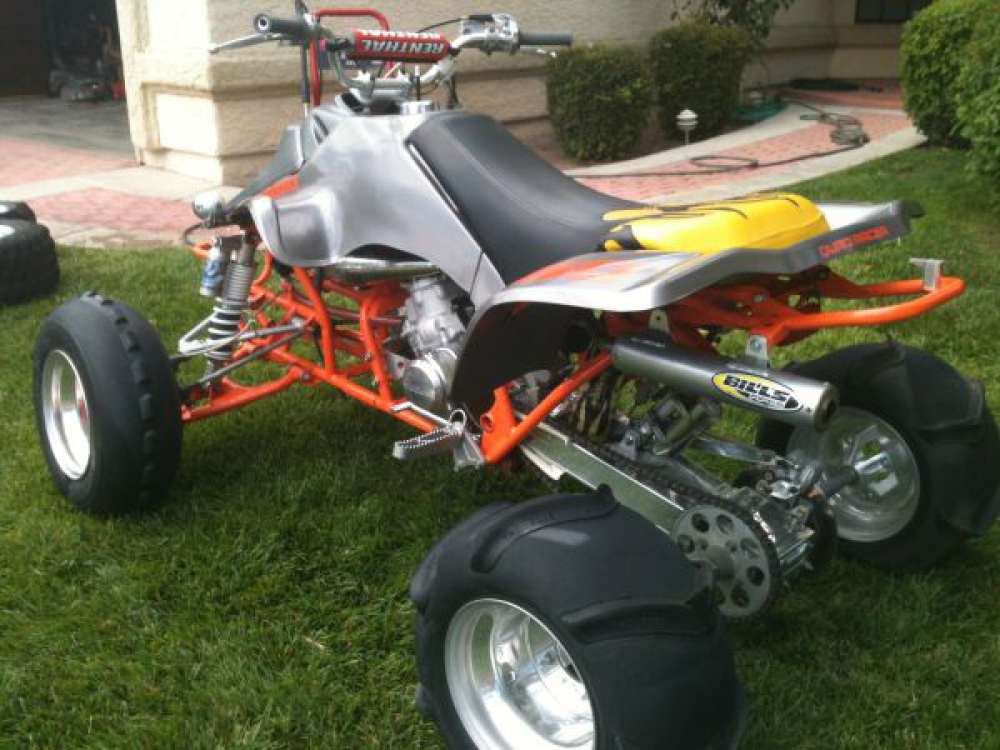 Description: Heres mine. I just bought it back in september '12 from a good friend. It was originally my dads bike from 87-01. He originally bought it as an upgrade from a lt230 quadsport for him. We did a lot of dune riding as i was growing up. I had a 230 quadsport at that time and was always super happy to throw a leg over dads 250. I eventually got a blaster so it kind of evened up things a bit. But still loved riding this one because it didnt land as hard haha. years went by and i eventually bought it from him after i was grown up and moved out and put my girlfriend on it (which is now my wife) for 2 seasons. Then i moved her up to a trx250r, sold it to a good friend of mine who put quite a bit of wrench time into it. He has had it for about 8 years or so. He picked up a super clean yfz for his wife. So it was time to sell. I couldnt let it go to anyone else, especially after he had a couple of lowball $1500 cash offers. I told him I wanted it back, no one else was going to get my dads bike back, not for $1500! Im such a sentimential turd sometimes. But i knew i would kick myself for years to come if i didnt get it back. This bike has so much history and i barely even touched the tip of the iceberg here. So with all that aside. It is an 87 LT250R. Internal it is a "back in the day" trinity stage 4 spec port and head setup, running a newer style pwk 38mm. Bills pipe, yfz shocks, camber mod, silver maiers, carbon look hood etc etc. I Plan on knocking it apart this coming summer and putting it back to the blue/yellow colors. But for now, i rode it a few times this sand season. Just glad to have it in the garage if nothing else.