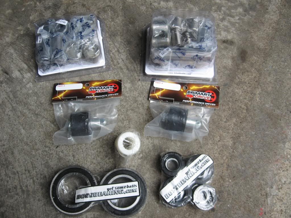 Front and rear wheel bearings, steering stem bushing, swing arm bearings and seals, linkage bearings and seals, chain rollers  87-90 LT250r $75 shipped USA only.