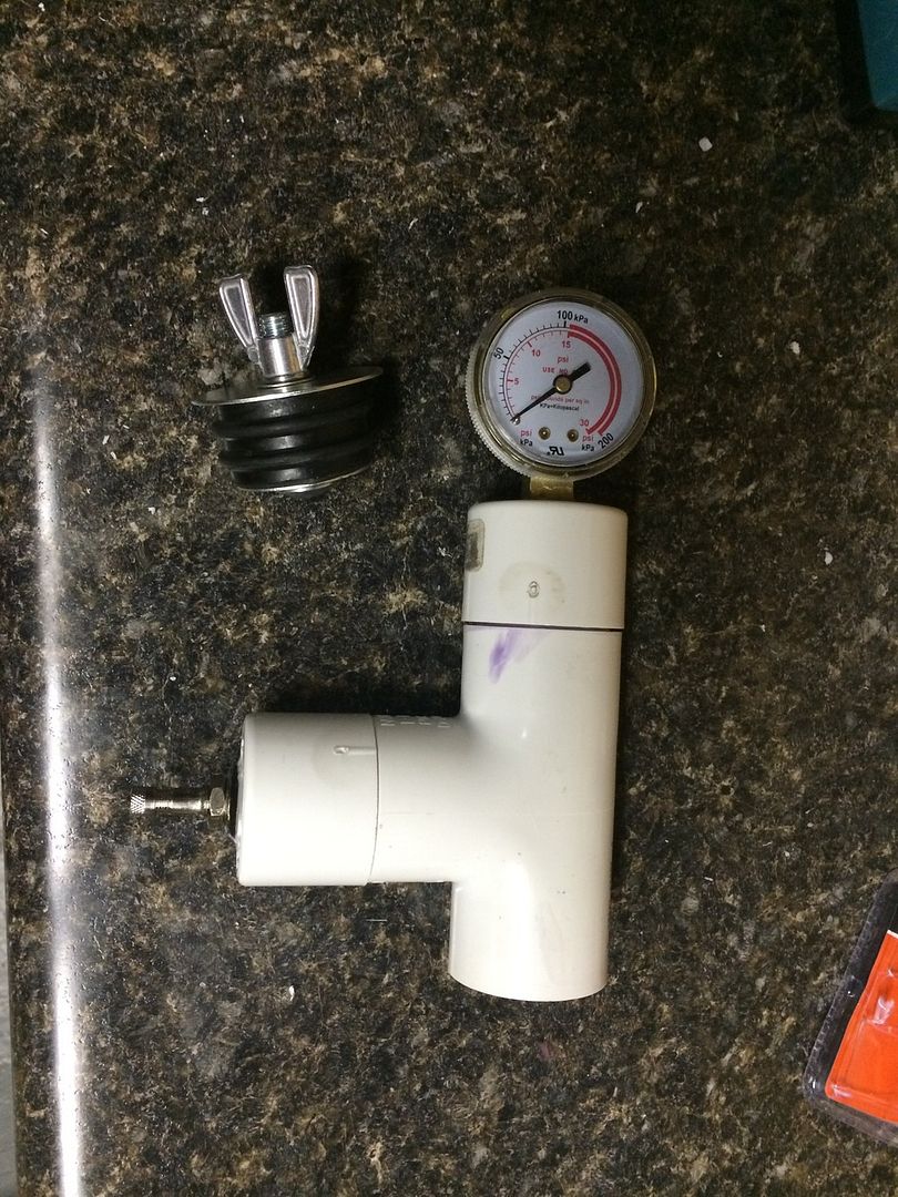 Here is a photo of what I made. Plumbing plug for the exhaust. 1 3/4" worked for that and than just pvc for the intake a nice welding gas gauge must read low. Around 5lb, and a valve stem from auto parts store.