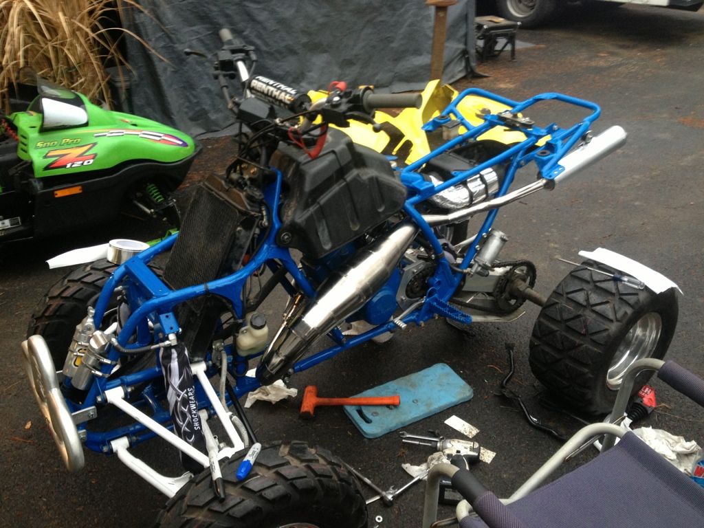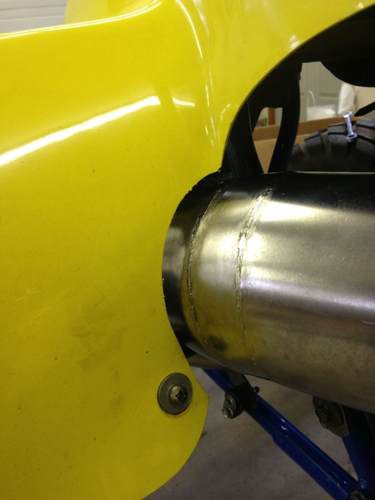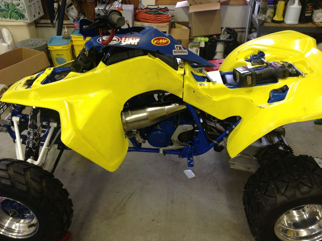 Here it is with the exhaust mocked up. More pictures to come later tonight or tomorrow. The pipe is on, I fixed the suspension link so the ride height isnt so jacked, and now I have to cut the notch in the front fender for the exhaust and then re-assemble plastics and incidentals.