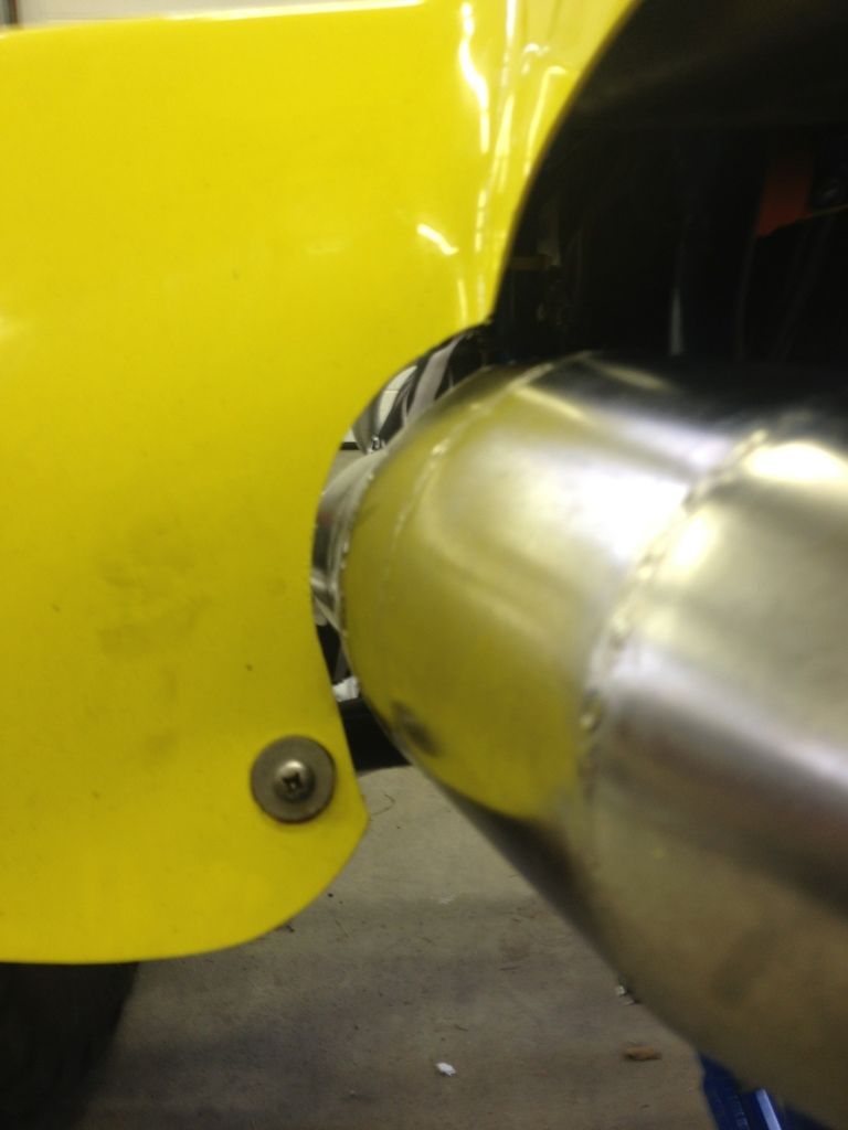 And here is a picture of the new pipe installed. It just touches the frame at the rear of the expansion chamber. Going to let it rub and then see if it requires adjustment and I need to put a dimple in it with a ball peen hammer.